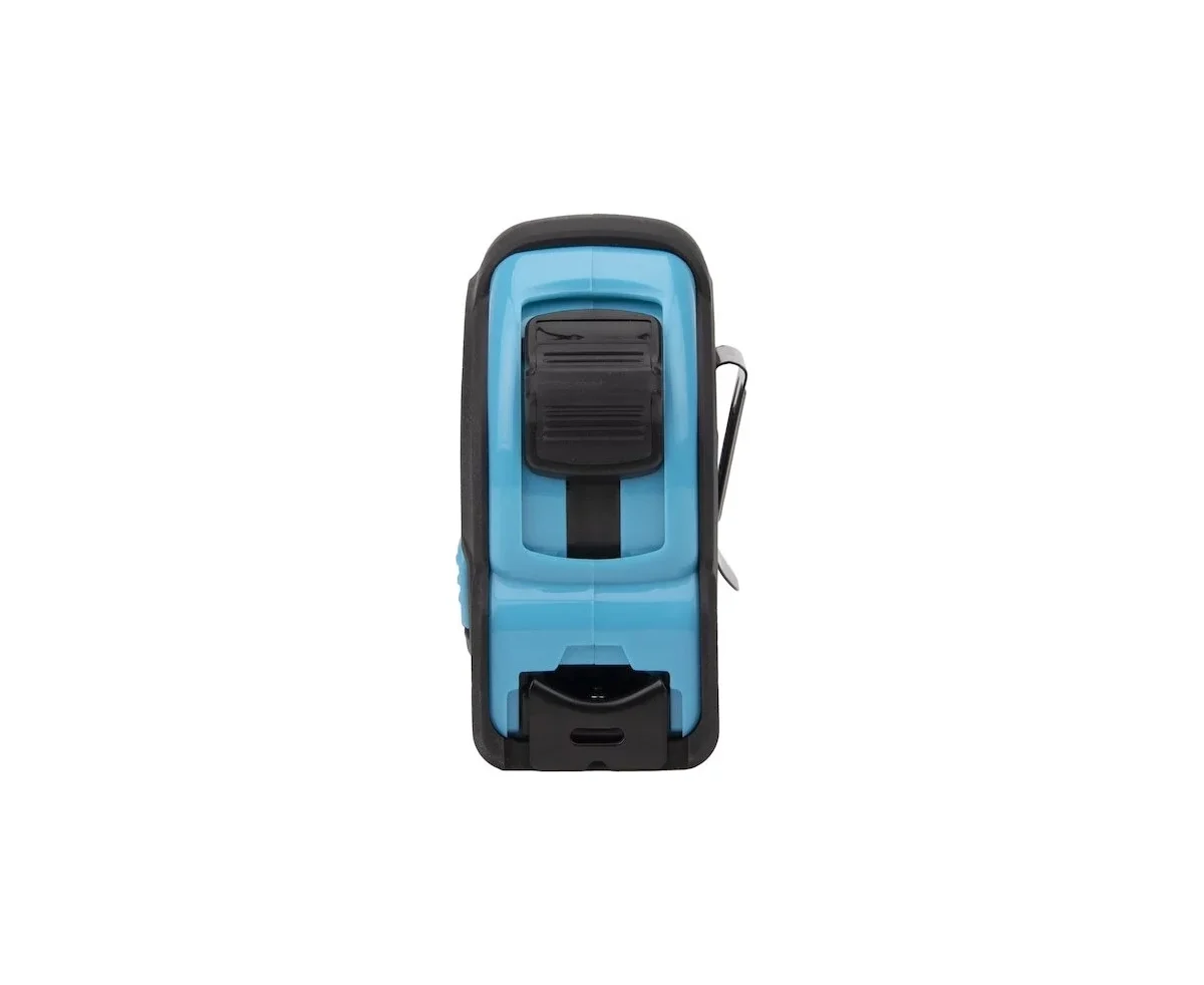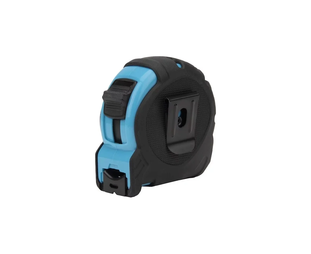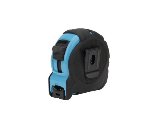 Эргономичный дизайн корпуса обеспечивает удобный захват, а тканевый ремешок и металлическая клипса позволяют носить рулетку на запястье или фиксировать на поясе, что обеспечивает надежность и удобство при проведении измерений.