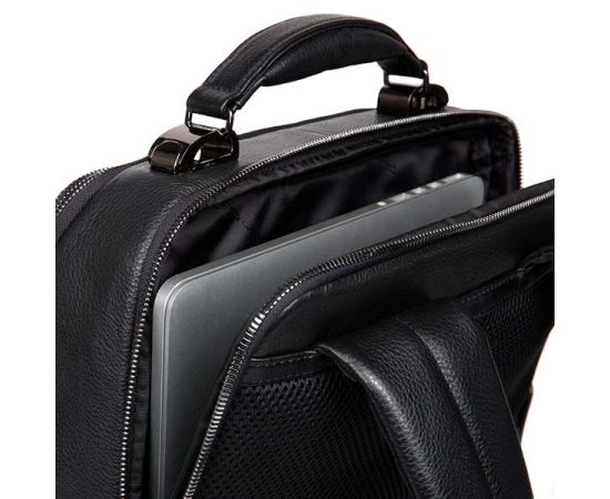 Солидный мужской кожаный рюкзак из коллекции Piquadro Modus Special. Изготовлен из структурной телячьей кожи с превосходной металлической фурнитурой. Рюкзак имеет два отделения с отсеком для 15,6 дюймового ноутбука и планшета, карманами для телефона и ручек. На передней части расположен большой карман на молнии, на задней части крепление на ручку дорожного чемодана.