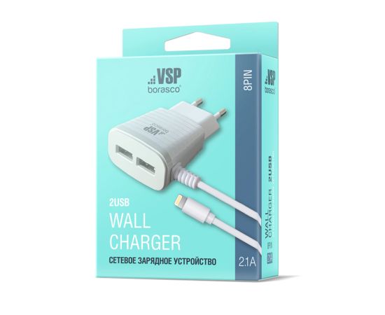 Сетевое зарядное устройство 2USB, 2,1A, 8pin, белое