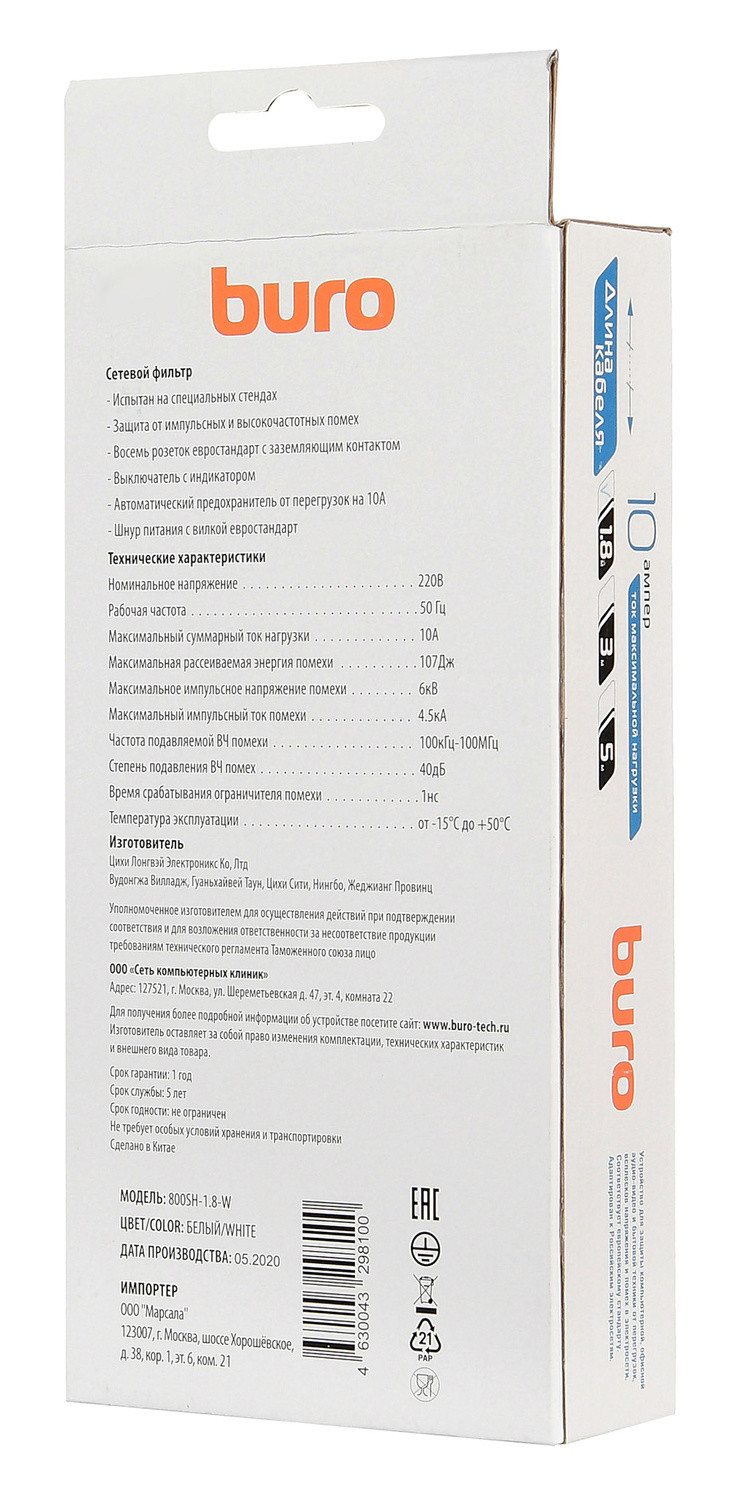Сетевой фильтр Buro 800SH-1.8-W 1.8м (8 розеток) белый