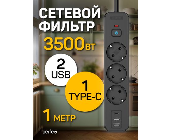 Сетевой фильтр Perfeo "REAL HOME" 1,0м, 3 розетки, 2USB+1TYPE-C, 16А, 3500 Вт,тройная защита,черный.