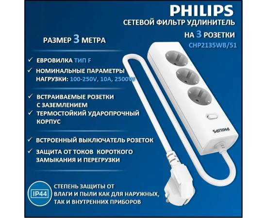 Сетевой фильтр Philips CHP2135WB/51 3м (3 розетки) белый (коробка)