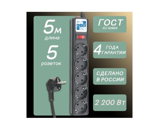 Сетевой фильтр Power Cube SPG5-С5 5.0 м, 5 розеток, 10А, black