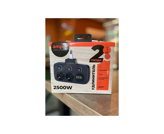 Сетевой удлинитель, Amper 0,2м, 2 розетки, 3*0,75мм, 10А, 2500 Вт, 3usb, 1Type-C, 3кн, черный