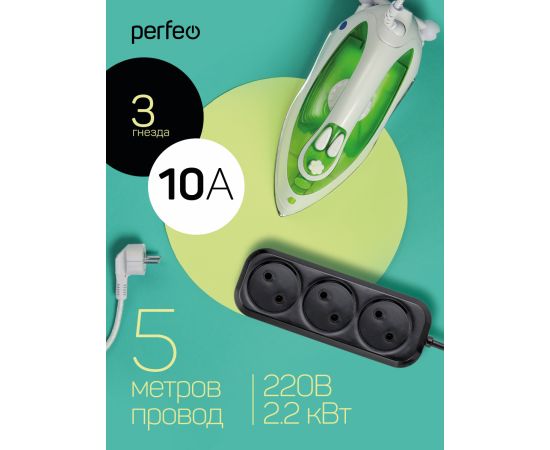 Сетевой удлинитель Perfeo "RU POWER", 5,0м, 3 розетки, без заземления, (Р16-012), чёрный
