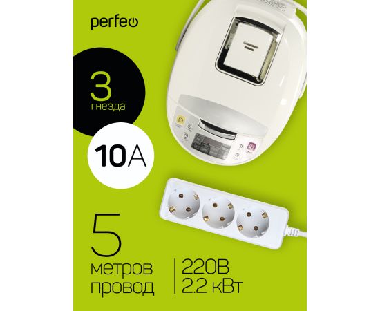 Сетевой удлинитель Perfeo "POWERMATE", 5,0м, 3 розетки, с заземлением, (PF-PE-3/5,0-W), белый