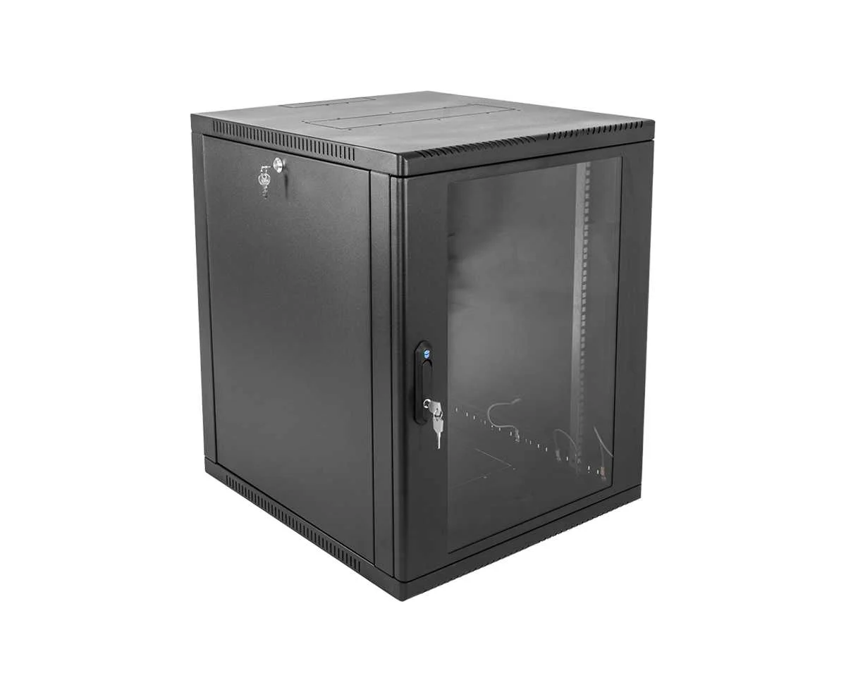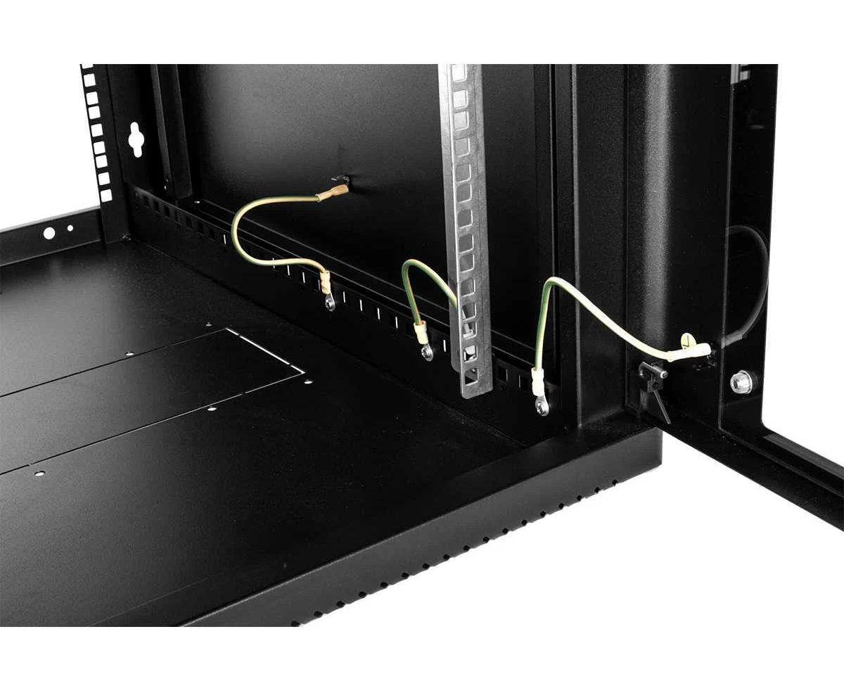 Настенный шкаф 19" ШРН имеет цельнометаллическую сварную конструкцию, он удобен для быстрой установки и монтажа оборудования, так как не требует сборки. Отсутствие острых углов с фронтальной стороны повышают безопасность при эксплуатации и обслуживании шкафов, что помогает исключить человеческие травмы при соприкосновении со шкафом. Комплектация дверью с тонированным ударопрочным стеклом. Новая конструкция стеклянной двери с механическим креплением стекла увеличивает её жесткость, и обеспечивает легкую замену стекла при его повреждении. Возможна установка двери, как с правой, так и с левой стороны. Новый усиленный точечный замок с поворотной ручкой увеличивает жесткость фиксации двери в закрытом положении и защиту от несанкционированного доступа, а также обеспечивает удобство при её открывании.