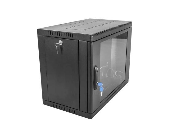 Настенный шкаф 19" ШРН имеет цельнометаллическую сварную конструкцию, он удобен для быстрой установки и монтажа оборудования, так как не требует сборки. Отсутствие острых углов с фронтальной стороны повышают безопасность при эксплуатации и обслуживании шкафов, что помогает исключить человеческие травмы при соприкосновении со шкафом. Комплектация дверью с тонированным ударопрочным стеклом. Новая конструкция стеклянной двери с механическим креплением стекла увеличивает её жесткость, и обеспечивает легкую замену стекла при его повреждении. Возможна установка двери, как с правой, так и с левой стороны. Новый усиленный точечный замок с поворотной ручкой увеличивает жесткость фиксации двери в закрытом положении и защиту от несанкционированного доступа, а также обеспечивает удобство при её открывании.