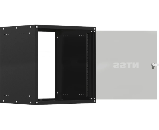 Компактный разобранный настенный шкаф NTSS серии «W» с передней дверью, открываемыми боковыми стенками на защелках, задней стенкой и панелями пола и потолка.