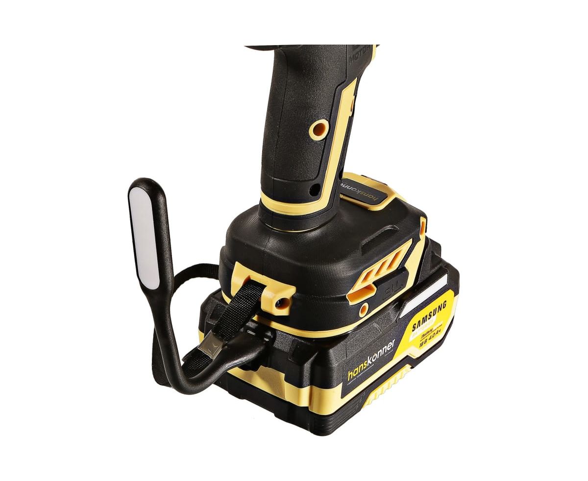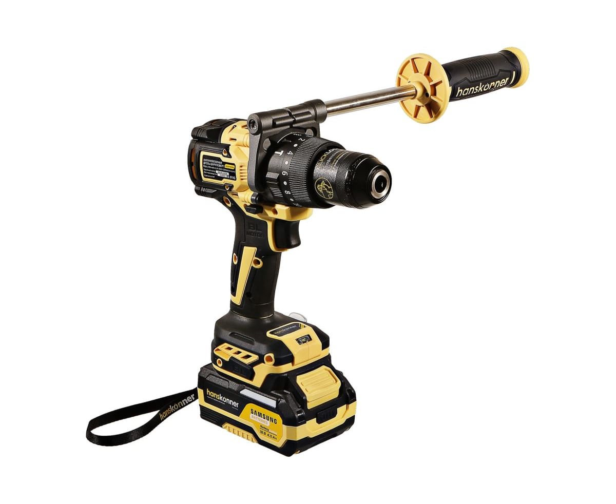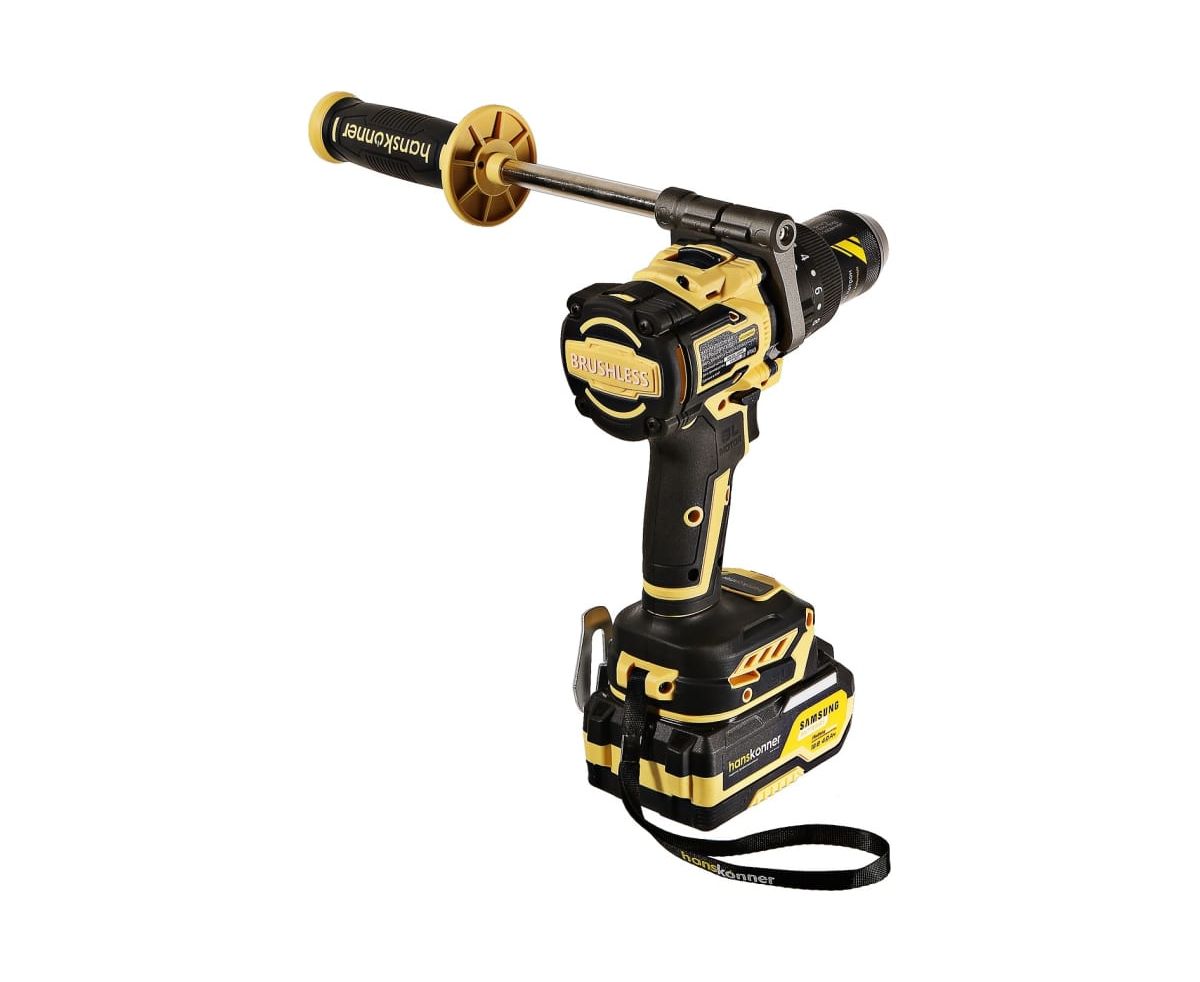 Аккумуляторная ударная дрель-шуруповерт Hanskonner подходит для любых работ, в том числе в стесненных условиях и труднодоступных местах без снижения производительности и потери качества работ. Мощный крутящий момент 165 Н·м позволяет использовать инструмент в 5 полноценных функциях: шуруповерт, ударная дрель, низкооборотистая дрель, ледобур, миксер. Компактный и легкий бесщеточный двигатель имеет выгодные параметры работы: