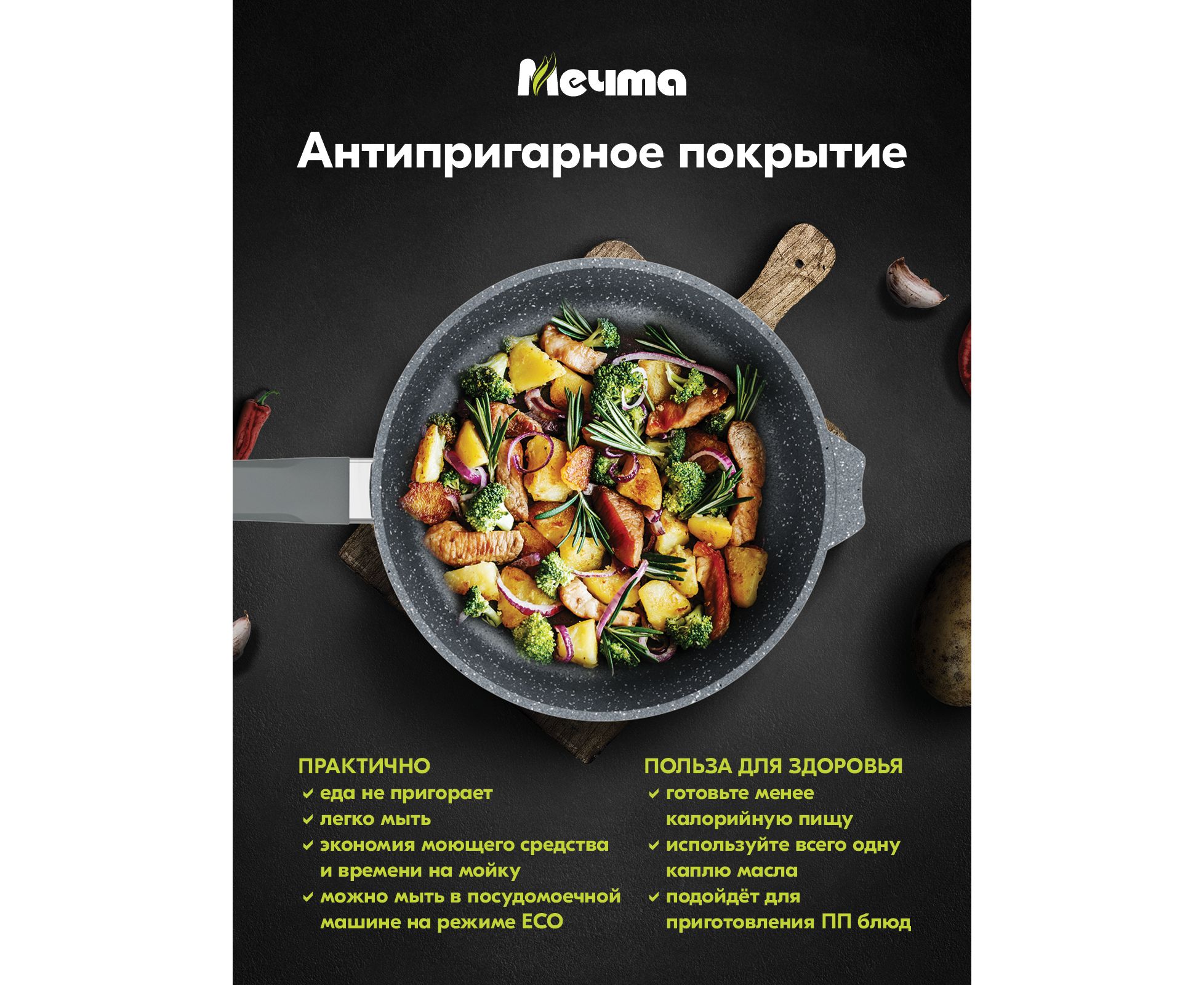Посуда линейки Гранит от торговой марки Мечта подходит для газовых, электрических, стеклокерамических плит, мытья в посудомоечной машине (согласно инструкции по эксплуатации).