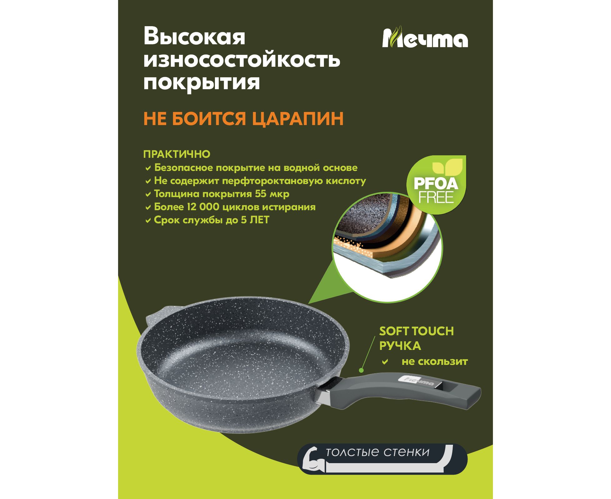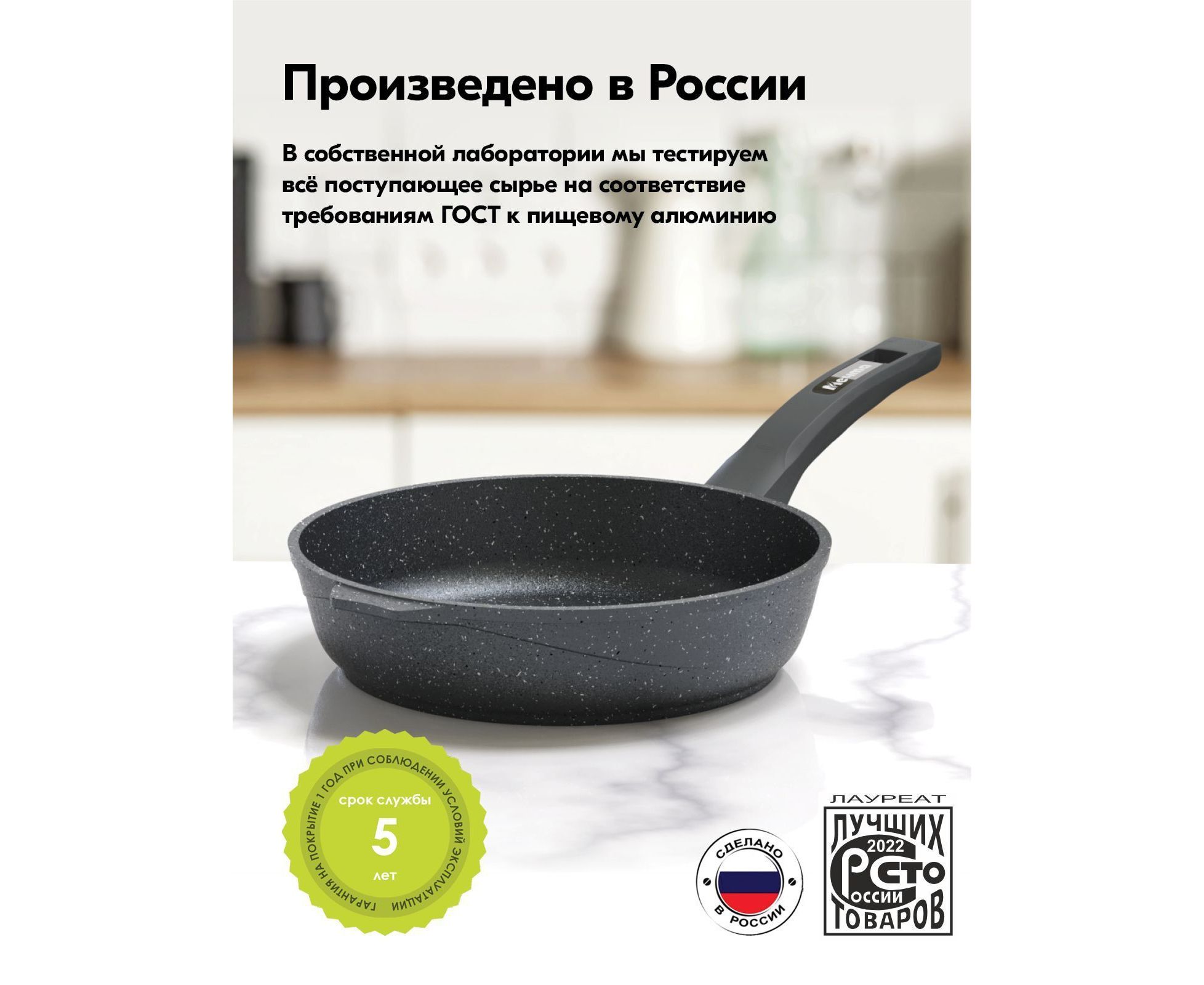 Массивное дно и стенки сковороды не подвержены деформации, царапинам и сколам за счет применения особой технологии производства.