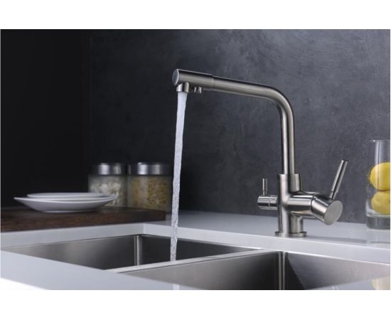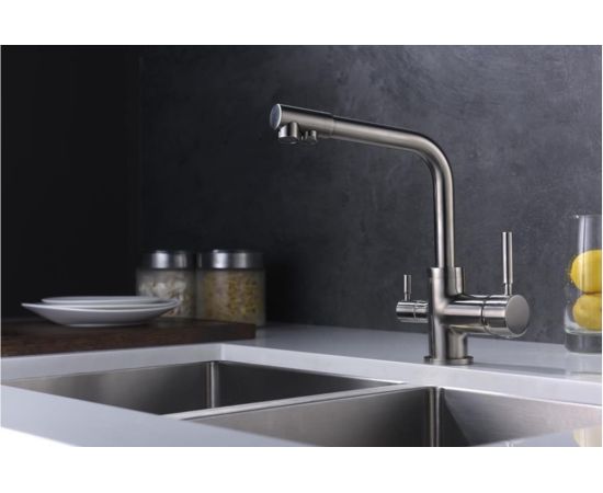 Данный кухонный смеситель двух-аэраторный имеет однорычажное управление и удобную ручку для регулировки подачи воды.