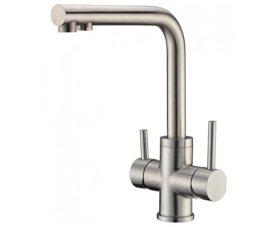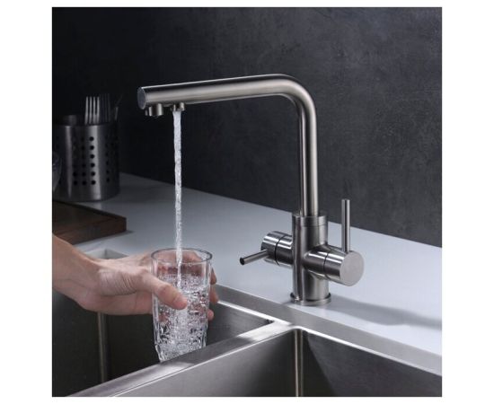 Кухонный смеситель с подключением к фильтру питьевой воды. Чистая вода подается из отдельного носика, снабженного аэратором. Смеситель имеет высокий излив, удобный для наполнения кастрюль и ваз. Выполнен из нержавеющей стали с покрытием Satin.