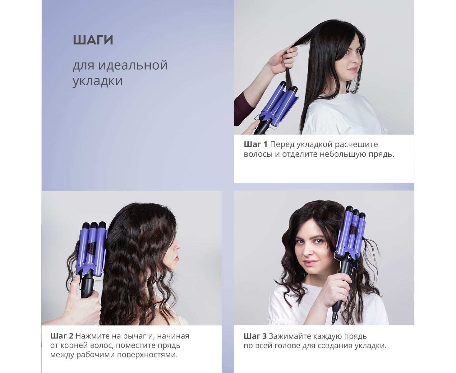 Особая форма тройного стайлера легко создает прически различных типов: