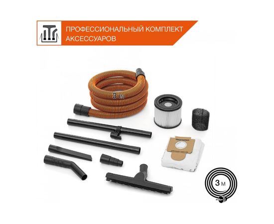 Шланг длиной 3 м позволяет собирать строительный мусор на высоте, без необходимости поднимать пылесос.