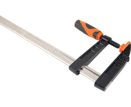 Струбцина F-типа предназначена для выполнении сборочных, столярных и слесарных работ. Корпус изготовлен из высококачественной закаленной стали высокой прочности. Эргономичная рукоятка с покрытием из термопластичной резины обеспечивает комфортную эксплуатацию. Специальные накладки зажимной части не повреждают зафиксированную деталь.