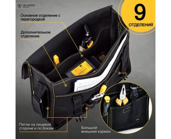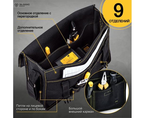 На лицевой стороне сумки находятся три петли, которые предоставляют возможность закрепить дополнительное оборудование, такое как ручки, отвертки или зажимы. Это позволяет иметь эти инструменты всегда под рукой и упорядочить рабочую зону. Один большой карман во всю ширину сумки и дополнительный карман на липучке.