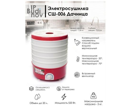 Электросушилка Дачница СШ-006 изготовлена из термостойкого пластика и предназначена для сушки фруктов, овощей, ягод, грибов, мяса, орехов, зелени и т.д. Сушка производится путем подачи разогретого воздуха, что позволяет полностью сохранять все вкусовые качества продуктов, активные вещества и витамины. Имеет 5 съемных регулируемых секций. Вместимость одной секции до 1 кг.