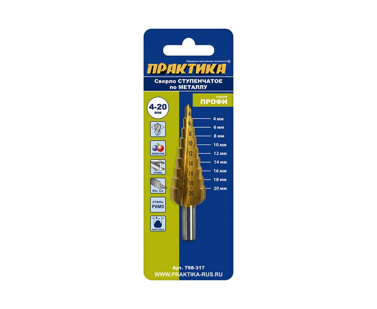 Сверло по металлу ступенчатое 4-20 мм шаг 2 мм TIN ПРОФИ ПРАКТИКА 798-317 предназначено для сверления отверстий в листовых металлических и пластиковых материалах.