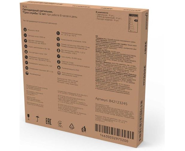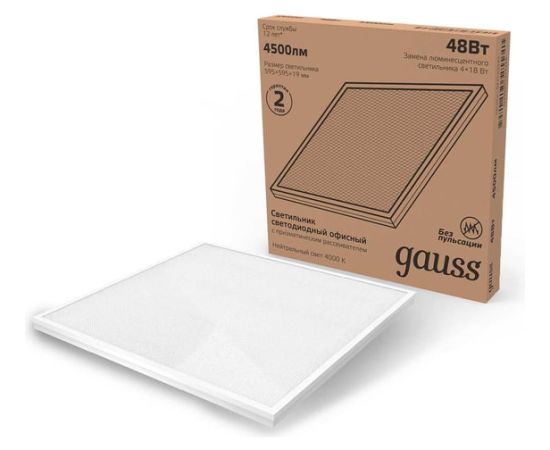 Технические характеристики Gauss 595x595x19мм 45W 4100lm 4000K призм. рассеиватель 842123245