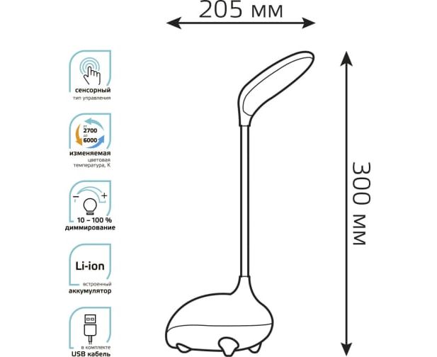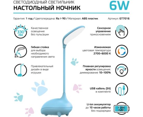 Настольный детский светильник Gauss qplus модель gtl701 6w 330lm 2700-6000k 5v li-ion 1200ma голубой GT7016 выполнен из безопасного материала. Оснащен Li-ion аккумулятором, что позволяет с легкостью переносить и использовать его в удобном для ребенка месте в течение длительного времени. Зарядка аккумулятора осуществляется от шнура с USB разъемом идущего в комплекте. Невероятно удобный и нежный светильник от Gauss прекрасно выполнит роль ночника в детской комнате. Мягкий и приятный на ощупь ночник станет самой любимой игрушкой малыша, а также незаменим источником света в ночное время. Детская серия светильников от Gauss с функцией плавного диммирования порадует ребенка великолепным дизайном по форме напоминающую зверька. Основное применение - это местное освещение игровой зоны, а также его можно использовать в качестве ночника. Технические характеристики Gauss gtl701 qplus модель gtl701 6Вт 330Лм 2700-6000k 5В li-ion 1200ma голубой GT7016 Вид крепления на основании Тип подключения USB Мощность светильника 6 Вт Тип лампы встроенные светодиоды Лампа в комплекте да Напряжение питания 5 В Цоколь нет(встроенные светодиоды) Защита от пыли и влаги IP20 Стиль детский Цветность регулируемый (2700-6000 К) Наличие диммера да Наличие абажура нет Материал корпуса пластик Поверхность плафона/арматуры матовая/матовая Цвет корпуса голубой Цвет плафона белый Сенсорное управление да Max высота 300 мм Вес нетто 0.26 кг Габариты без упаковки 205х90х300 мм Коллекция Qplus Беспроводная зарядка по стандарту Qi нет