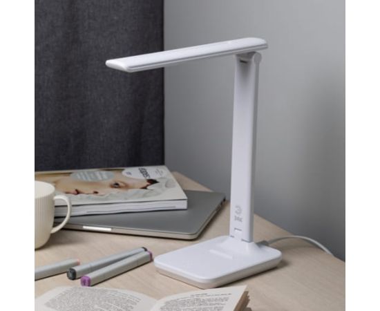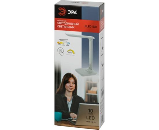 Настольный светильник ЭРА NLED-500-10W-W со светодиодами (LED) в качестве источников света в дизайне "под кожу". Удобная складная модель с сенсорным управлением, возможностью выбора цветовой температуры и плавным диммером для регулировки яркости.