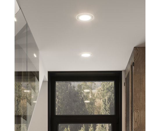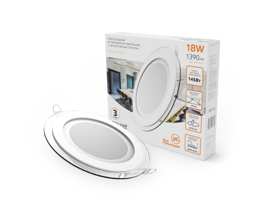 Светильник встраиваемый Gauss Downlight круг с декоративным стеклом и декоративным световым контуром. Мощность 18w, светит как лампа накаливания 145w, цветовая температура 3000К (теплый белый свет), световой поток 1390лм. Корпус выполнен из алюминия, окрашенного в белый цвет. Нейтральный лаконичный дизайн светильника найдет применение на всех видах натяжных, гипсокартонных или реечных потолков с глубиной просадки не менее 3.5см. Низкая пылевлагозащита исключает использование светильника в ванной, душевой и парной комнатах.