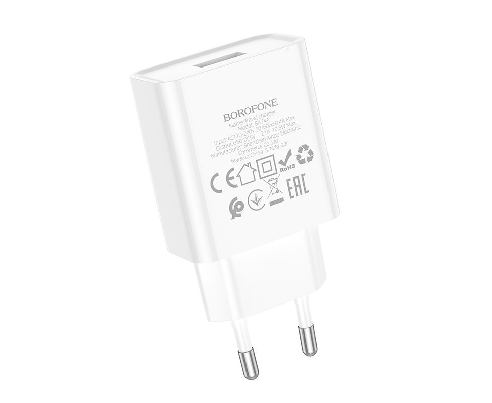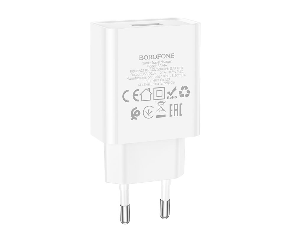Зарядное устройство BA74A предназначено для питания и подзарядки планшетов, электронных книг, мобильных телефонов и другой цифровой техники. Адаптер маленького размера помещается в кармане или в сумке. Выход USB имеют характеристики 5V/2.1A. Вилка европейского стандарта. Размер: 84*39*22 мм, вес: 30 г.