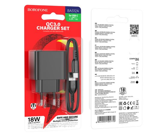 Сетевое зарядное устройство Borofone BAS12A – надежный адаптер с функцией быстрой зарядки, который поможет вам всегда оставаться на связи. Оснащен стандартной сетевой вилкой и USB портом для подсоединения кабеля, что делает его универсальным решением для зарядки смартфонов, планшетов и другой цифровой техники. Блок питания Borofone BAS12A поддерживает функцию быстрой зарядки QC 3.0 и выдает максимальную мощность в 18W. Изготовлен из качественных материалов: огнезащитного PC и ABS-пластика, что обеспечивает безопасность и долговечность использования аксессуара. Поставляется в комплекте с кабелем USB - Type-C длиной 1 м. Вес 64 г. Выполнен в двух цветах.
