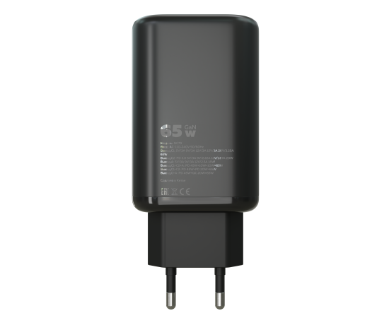Разъем подключения: USB, Type-C (PD). Количество разъемов: 3. Вход: АС110-240V 50/60Hz Выход С1: 5V/3A 9V/3A 12V/3A 15V/3A 20V/3.25A 65W Выход С2: PD3.0 5V/3A 9V/2.22A 12V/1.67A 20W Выход А 5V/3A 9V/3A 12V/2.5A 18W Выход C1+C2+A: PD45W +10W + 10W = 65W Выход C1+C2: PD45W+PD20W=65W Выход С+А: PD45W+QC20W=65W Led-индикатор: есть. Материал ЗУ: прочный ABС пластик. Размер: 107*46*25 мм. Вес: 100 г. Кабель: Type-C-Type-C 3.0A PD100W. Спецификация медной проволоки: 70 гр. 0,1*2 + 10 проволок 0.1*4. Наружное покрытие: TPE. Материал коннектора: 6-ядерная головка с чипами EMK TYPEC. Длинна: 2 м. Вес: 20 г. Комплектация:сетевое зарядное устройство, Led-лампа, кабель, буклет Цвет:Black,White