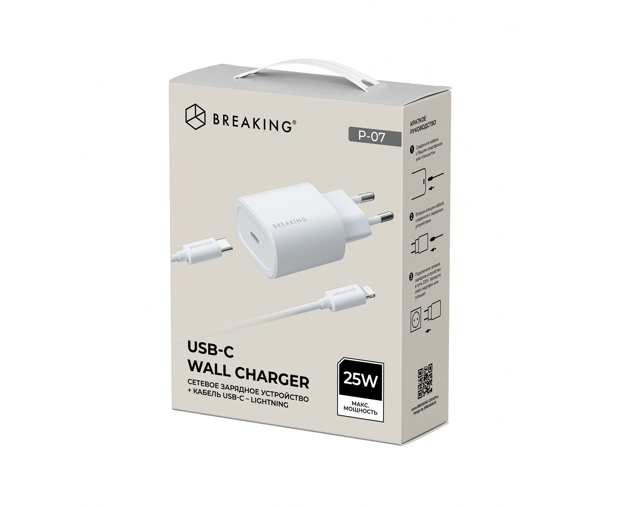 СЗУ Breaking P-07, USB-C, PD 25W, 3A + кабель USB-C - Lightning (Белый)