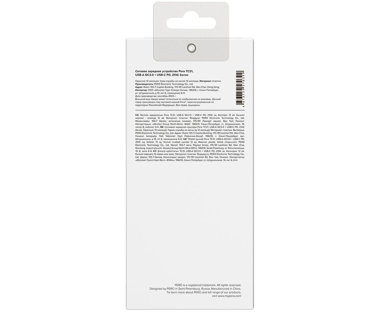 СЗУ PERO TC21 USB-A + USB-C, PD 25W белый