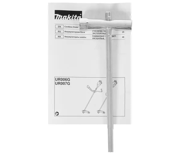 документация, катушка с леской, комбинированный ключ, наплечный ремень, сумка