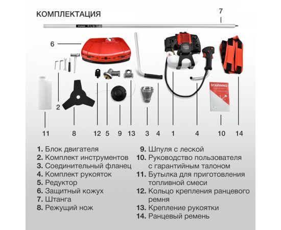 "Блок двигателя, Штанга, Комплект крепежа, Комплект рукояток, Ранцевый ремень, Защитный кожух, Бутылка, Нож, Шпуля с леской"
