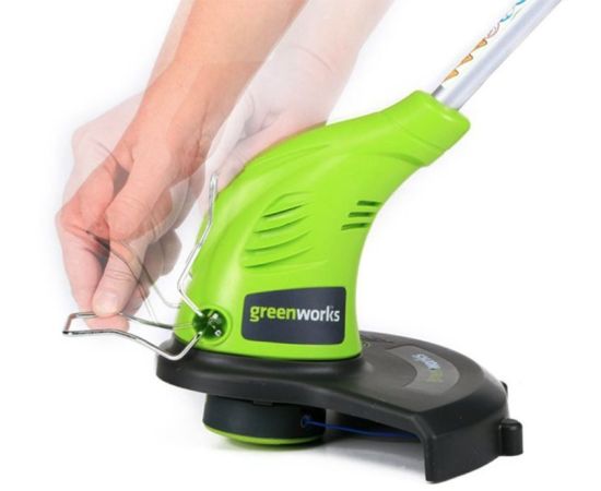 Режущим элементом выступает леска. Она накрыта специальным защитным кожухом, предотвращающим разлетание травы и случайное травмирование. Триммер электрический GREENWORKS GST5033 обладает телескопической штангой, позволяющей менять ее длину в зависимости от роста человека.