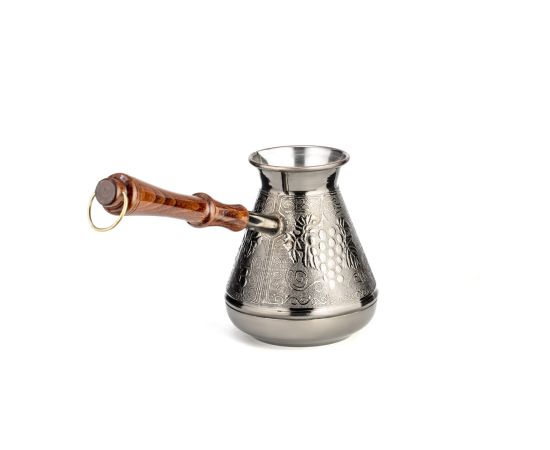 Как приятно выпить чашку свежего только что сваренного кофе. Подлинная находка для любителей настоящего ароматного напитка – турка LARA. Турка латунного цвета выполнена из высококачественной меди в аутентичном дизайне с изящным узором «Виноград». Произведено в России. Удобная лакированная ручка из натурального дерева не будет нагреваться при использовании, а металлическое кольцо позволит подвешивать турку и удобного хранить её. Узкое горлышко способствует наилучшему раскрытию вкуса. Подходит для приготовления натурального кофе на газовых и электрических плитах. Турка дополнит кухонный интерьер и подарит новый опыт в приготовлении кофе.