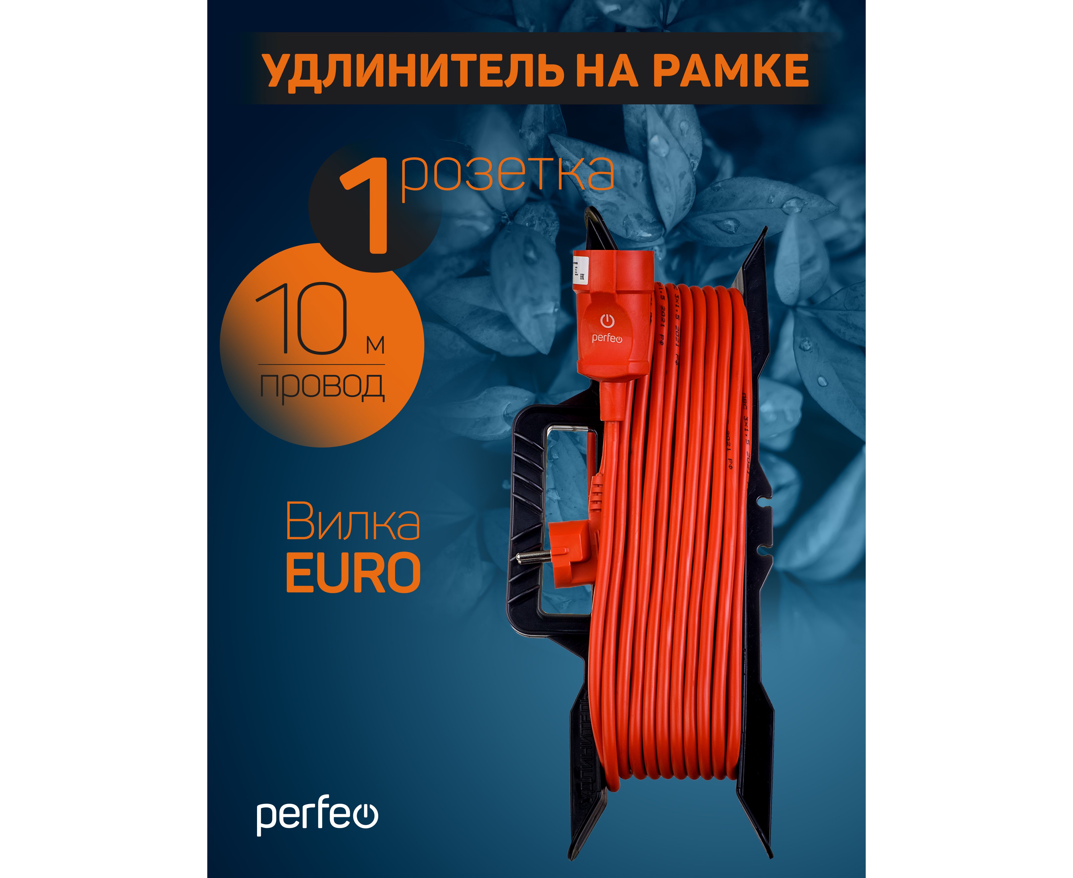 Удлинитель на рамке с заземлением Perfeo "RU POWER"10м 1гн 16А ПВС 3х1,5 ( УХз16-101) оранжевый.