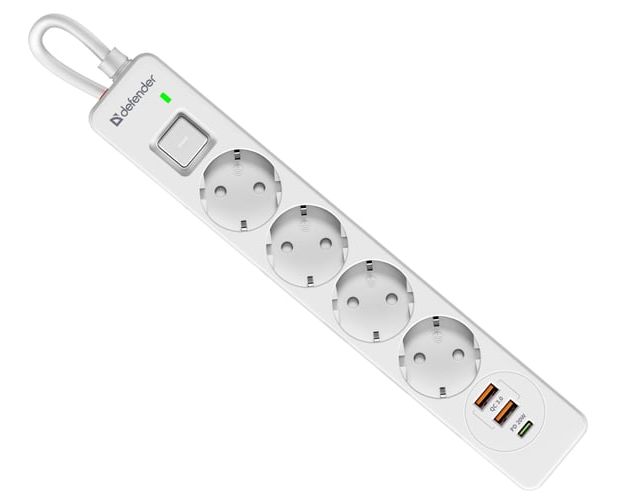 Удлинитель DEFENDER с сетевым фильтром DFS 143 3 м, белый, 4розетки, USB+TypeC (99434)