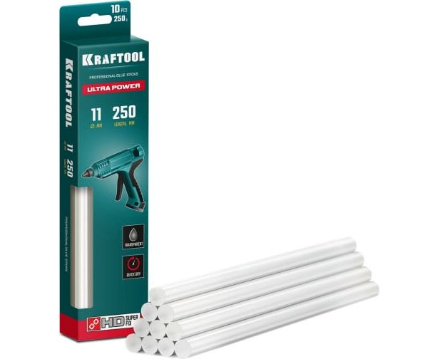 Ультрамощные прозрачные клеевые стержни KRAFTOOL Ultra Power 10 шт, 11x250 мм 06848-10 - универсальные клеевые стержни со специальным составом обеспечивающим надежное соединение после застывания.