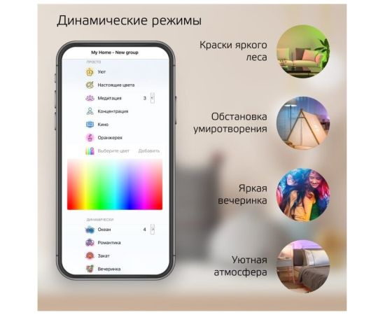 Изменение яркости, оттенка света и цвета голосом или с помощью мобильного приложения