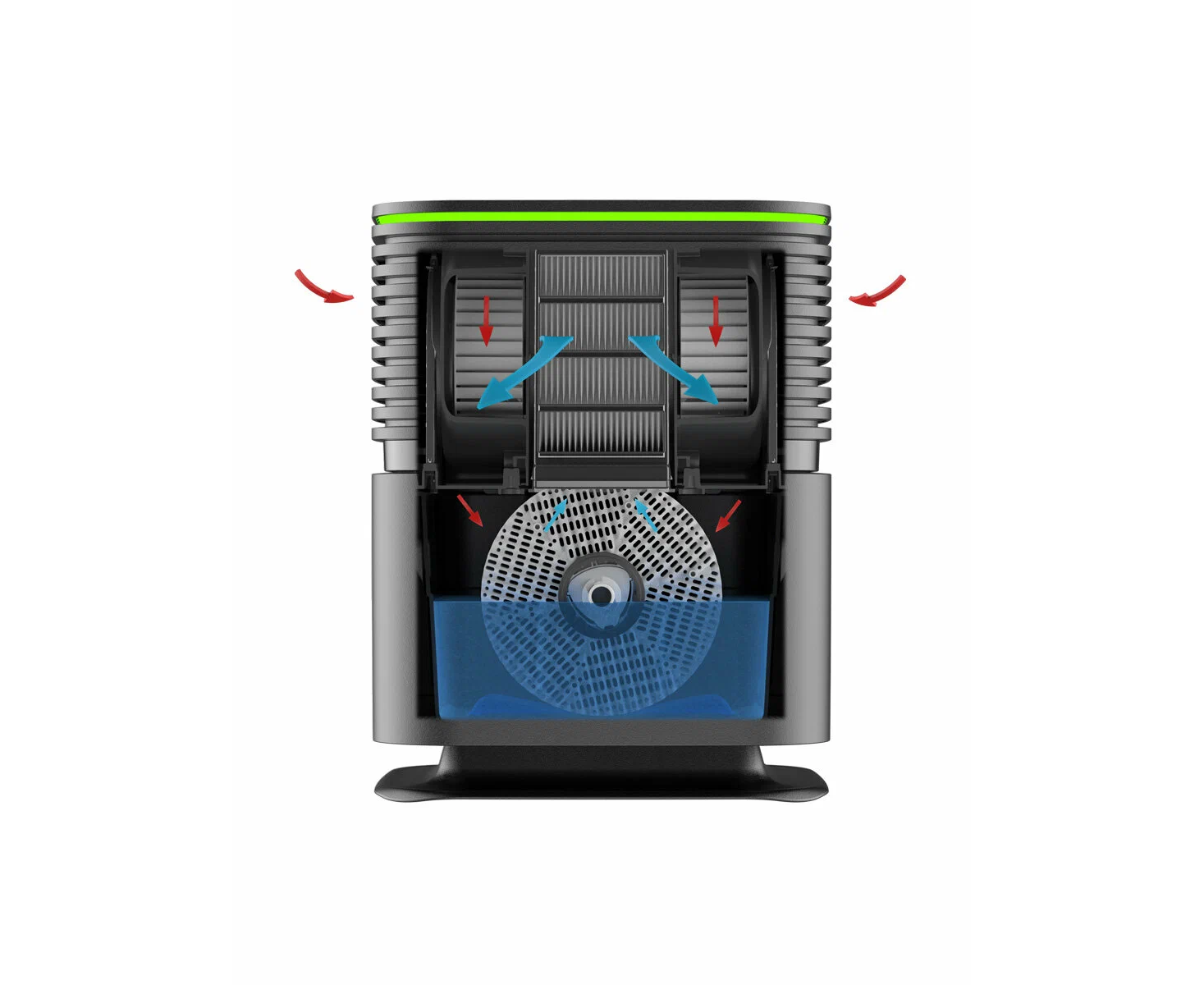 Комнатный воздух затягивается внутрь AW735 через боковые решетчатые стенки. Сначала он проходит через два фильтра HEPA13+антиформальдегид и очищается от вирусов, бактерий, пыли, аллергенов, неприятных запахов и формальдегида. Затем поступает на пластинчатый барабан, который медленно вращается в поддоне с водой, где насыщается влагой. После этого очищенный и увлажненный воздух поступает обратно в помещение через переднюю решетчатую стенку. Эффективность очистки: CADR 320 м³/ч - 99,97%.