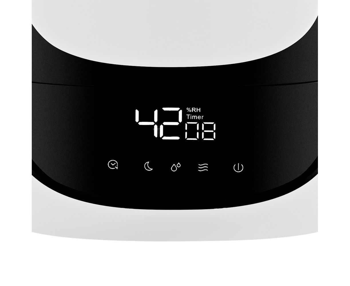 Вы можете задавать желаемый уровень влажности от 40 до 90% с шагом 5%, а также время работы увлажнителя - от 1 до 12 ч с шагом 1 ч. На дисплее отображаются текущая влажность и таймер. Вы можете выключить дисплей, воспользовавшись кнопкой “Ночной режим”.