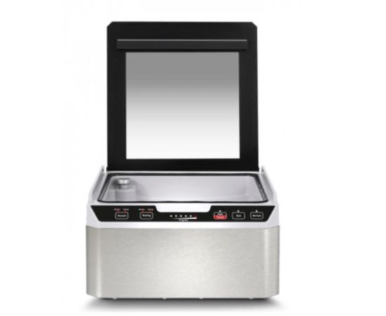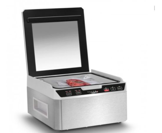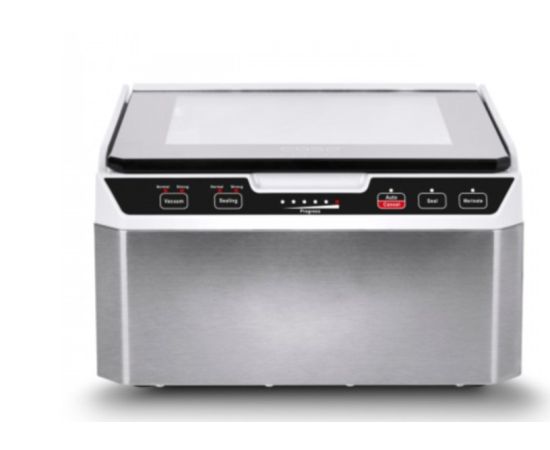 Корпус выполнен из нержавеющей стали с прозрачной крышкой из закаленного стекла. Прорезиненные ножки позволяют надежно зафиксировать упаковщик на любой, даже на влажной, поверхности.
