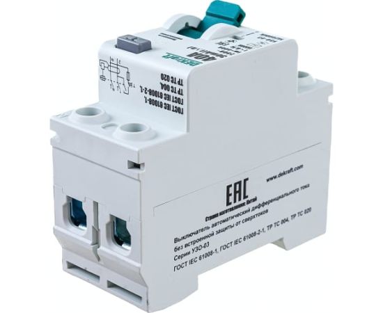 Выключатель дифференциального тока DEKraft 2P 40А 30мА тип AC 6кА УЗО-03 14209DEK не обеспечивает защиту от перегрузки и токов короткого замыкания, он используется исключительно в сочетании с автоматическим выключателем, либо предохранителем.