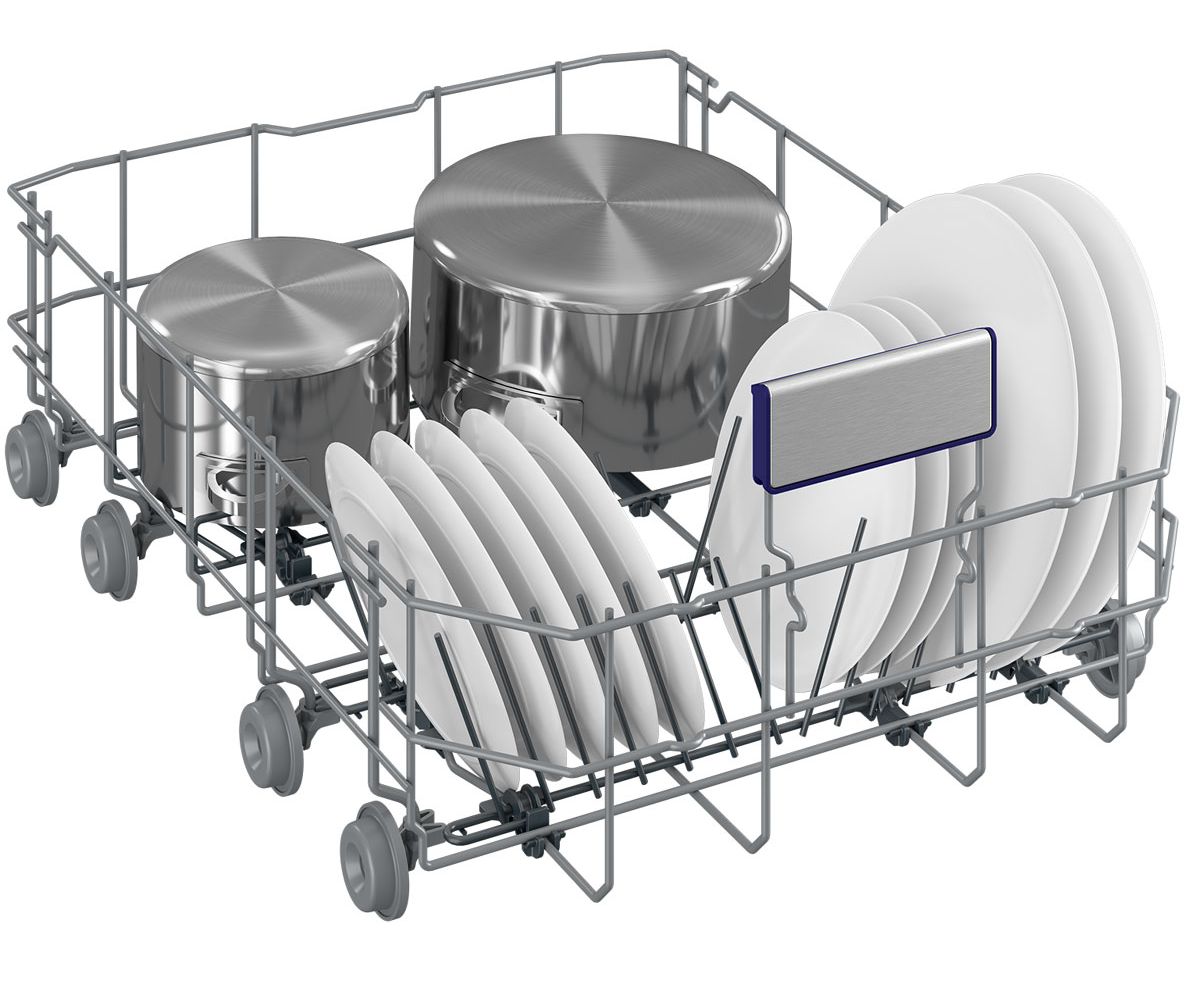посуда моется в верхней корзине, а кастрюли и сковородки можно мыть в нижней корзине.