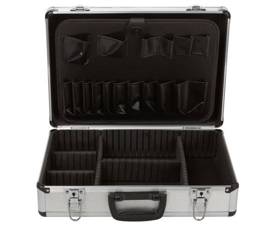 Ящик-чемодан предназначен для хранения и удобной транспортировки инструментов. Изготовлен из алюминия, а внутренняя отделка выполнена из мягкого пористого материала, что обеспечивает более бережное хранение инструмента. Переставные перегородки позволяют максимально эффективно использовать внутреннее пространство. Чемодан надежно закрывается с помощью металлических защелок. Удобная рукоятка обеспечивает комфортную переноску. Инструментальный ящик применяется как в профессиональной сфере, так и в быту: он очень вместительный, помогает упорядочить нужные в работе предметы и всегда держать их под рукой.