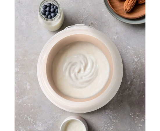 Прибор укомплектован чашей ёмкостью 1 литр с прозрачной крышкой. Готовый йогурт можно хранить в холодильнике прямо в чаше. Йогуртница равномерно нагревает чашу с ингредиентами, поддерживая необходимую температуру.