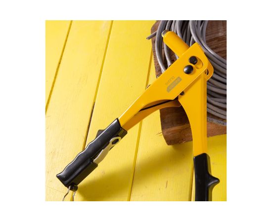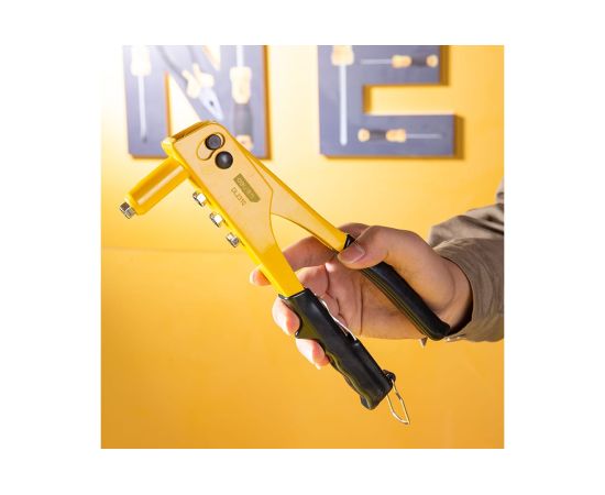 Преимуществом заклёпочника являются прочный стальной корпус, мягкие противоскользящие резиновые накладки на рукоятях и хромомолибденовые сменные головки.