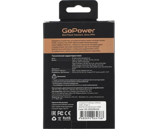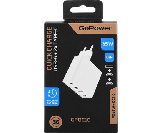 Зарядное устройство GOPOWER 00-00028405 1USB+2TYPE-C 65W QC3.0 GAN White